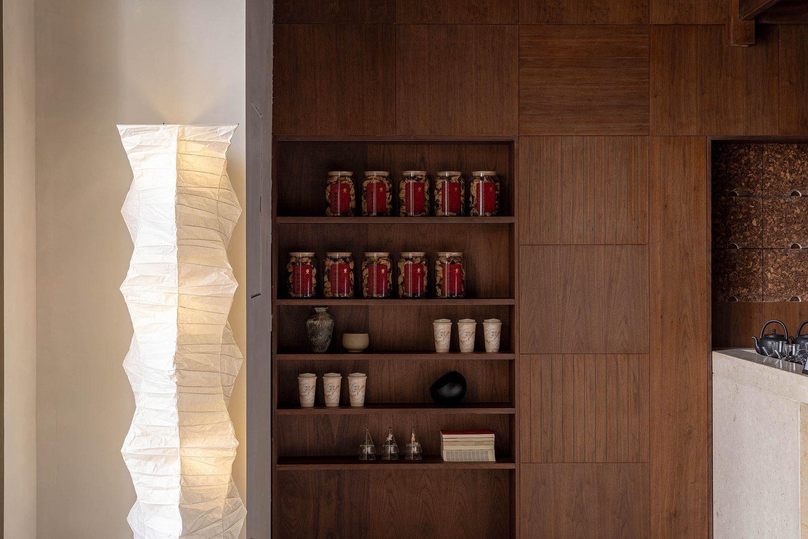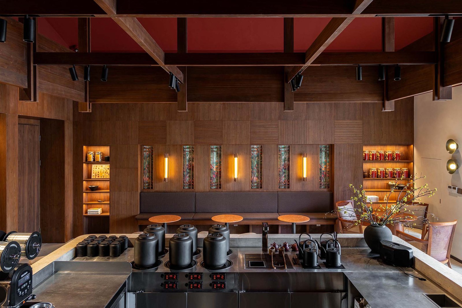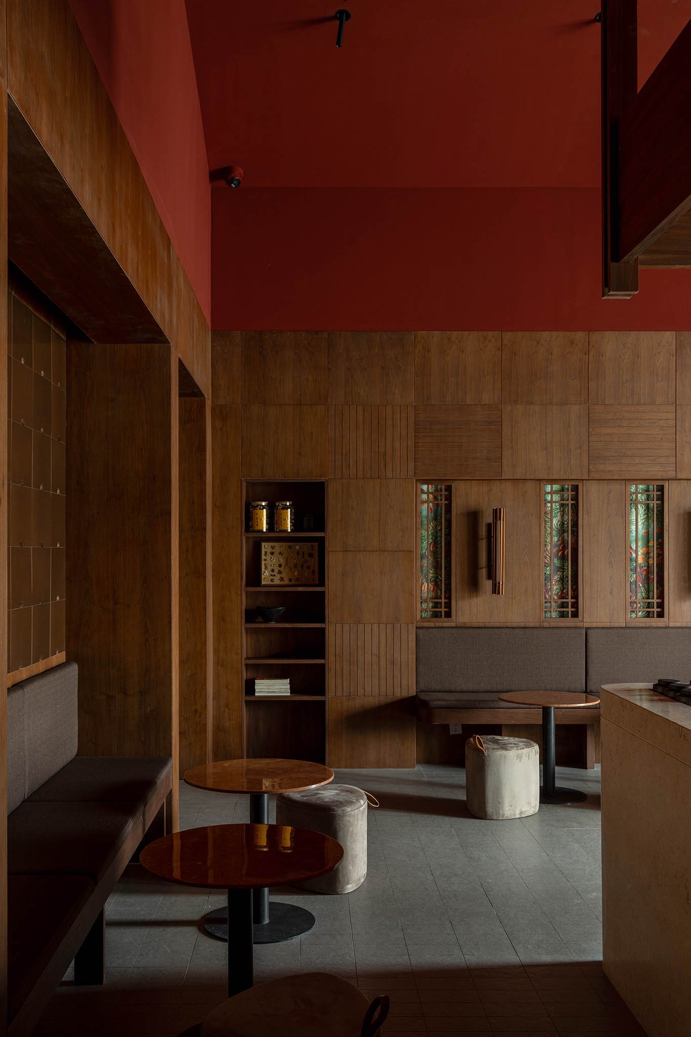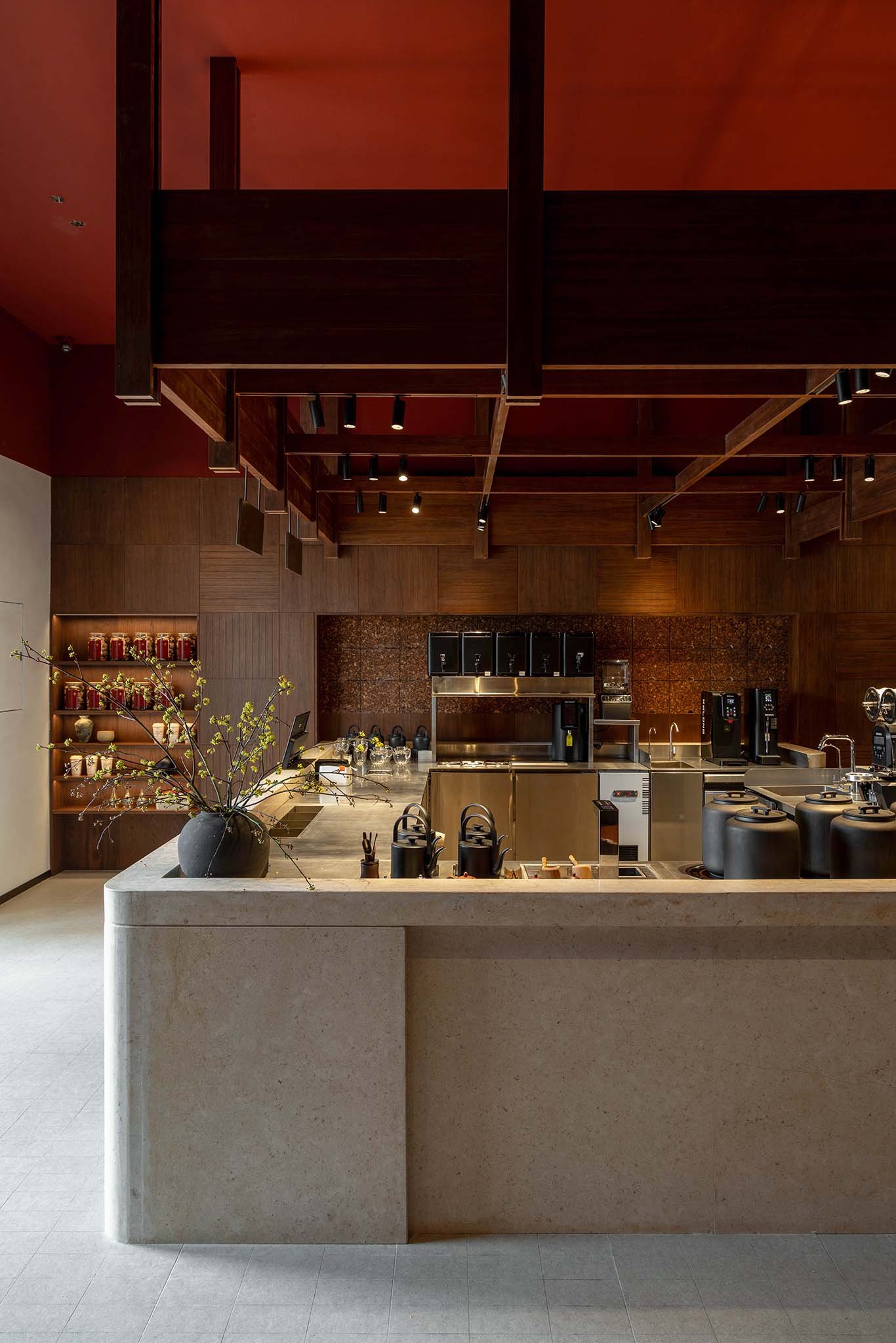 In this project, we focused on aligning design strategies with the brand’s heritage and visual identity. For a commercial space, a sense of textural sophistication emerges from its atmosphere, which in turn relies on meticulous control of spatial layering, materiality, and proportions. Oriental essence, a defining element for a Chinese herbal tea space, became the core of this project’s atmospheric expression. The cultural heritage of Suzhou—the brand’s birthplace and a city emblematic of Eastern traditions—intertwines with the origins of herbal medicine, collectively shaping consumers’ holistic perception of the brand and its spatial identity.