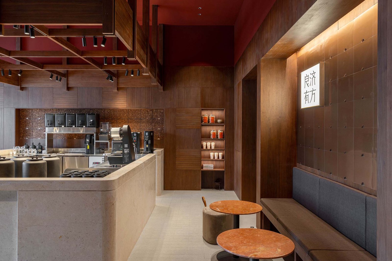 Liangjiyoufang Chinese Herbal Tea Shop, located by Jinji Lake in Suzhou, originates from the “China Time-honored Brand” Li Liangji. The site occupies the previously underutilized lobby corridor space of the Li Liangji Traditional Chinese Medicine Clinic. Given the compact scale of the space, architectural interventions were limited, prompting us to pivot toward a brand-centric design narrative that adapts to the site’s conditions.